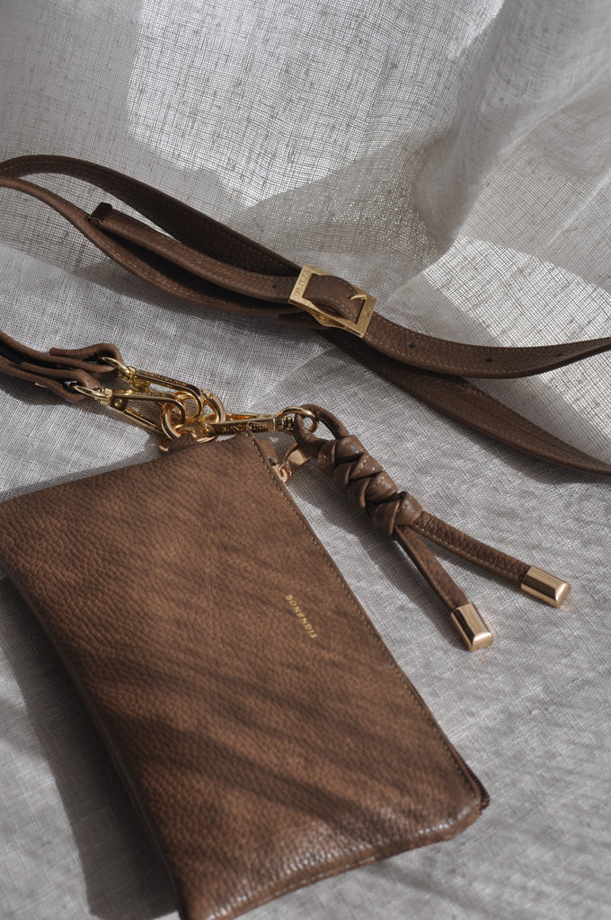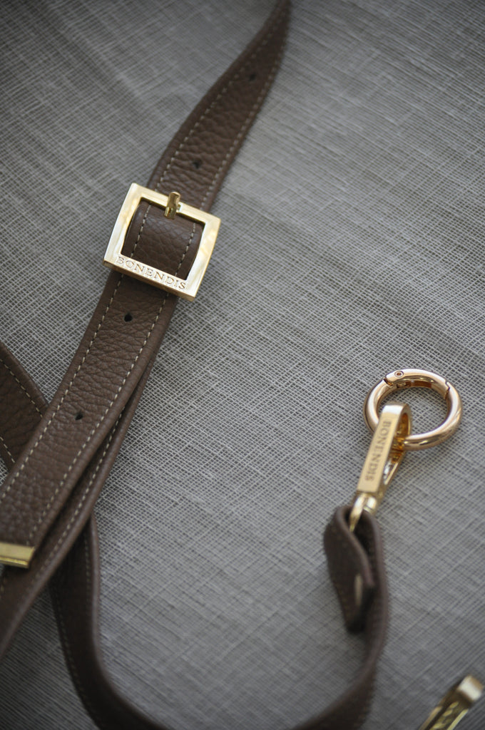 Το δερμάτινο λουράκι Bonendis συνοδεύεται από ανοιγόμενο χρυσό κύκλο. Έχει πλήρες μήκος 120 cm για να το φορέσει ως χιαστί.