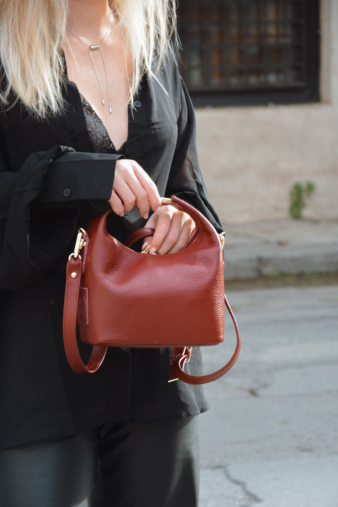 Είναι ένα αληθινό δερμάτινο κόσμημα. Μικροκαμωμένη, κομψή, είναι διακοσμημένη με όμορφες λεπτομέρειες και μια χρυσή αγκράφα που στεφανώνει αυτή την υπέροχη μαλακή τσάντα χειρός. Συνδυάζεται με δερμάτινο λουράκι για να μπορεί να φορεθεί ως χιαστί τσάντα. Ένα κομψό αξεσουάρ σχεδιασμένο για να αναδεικνύει το στυλ σας με κομψότητα σε κάθε περίσταση.