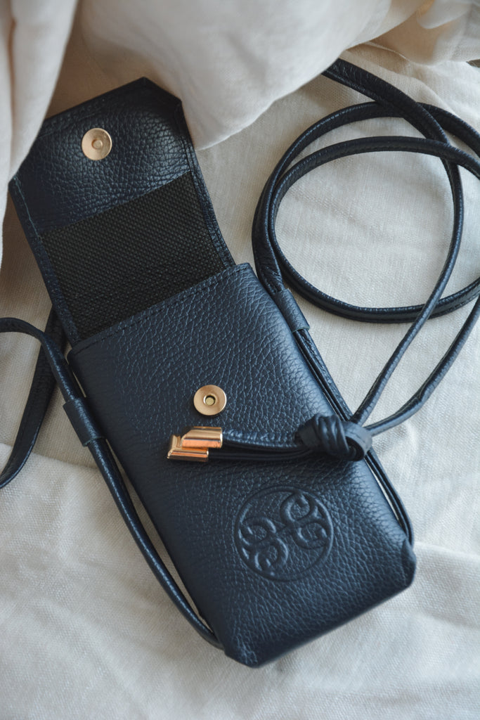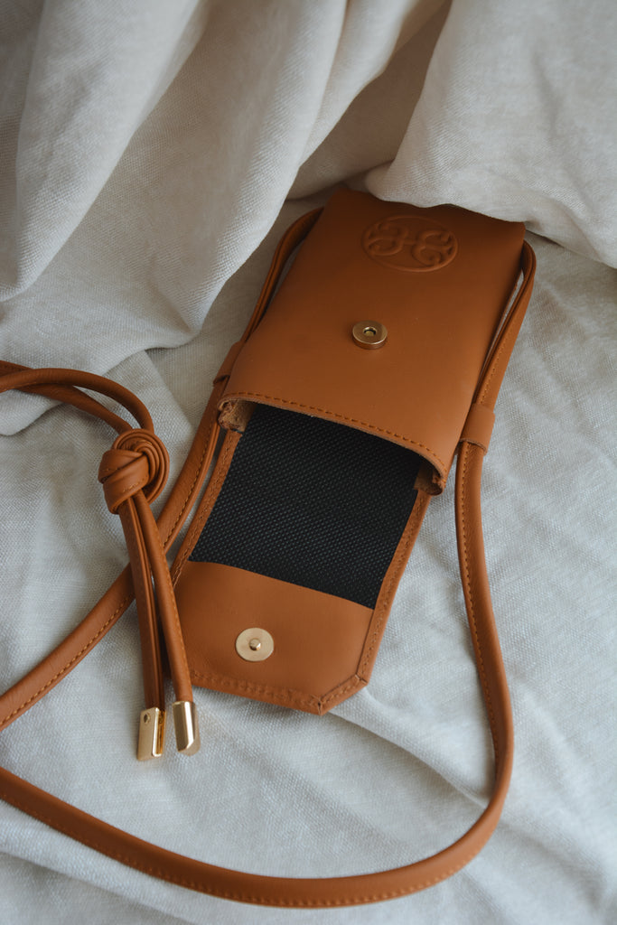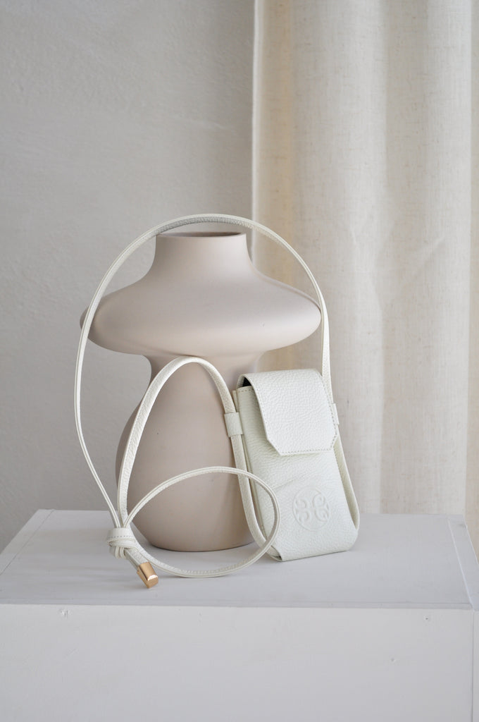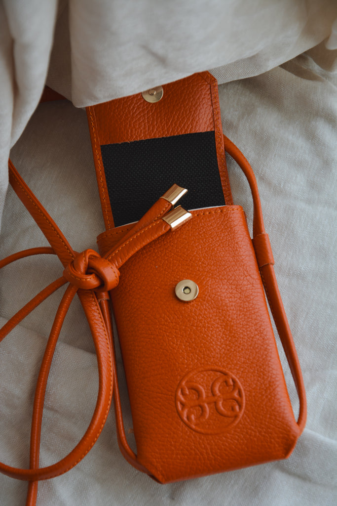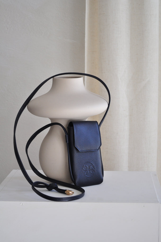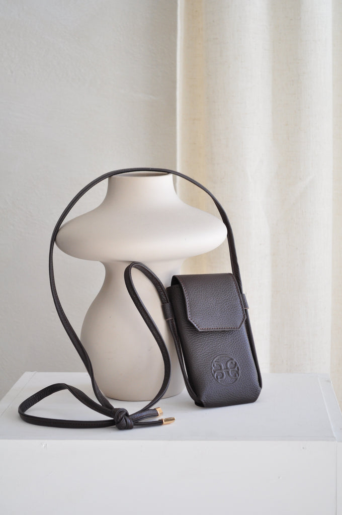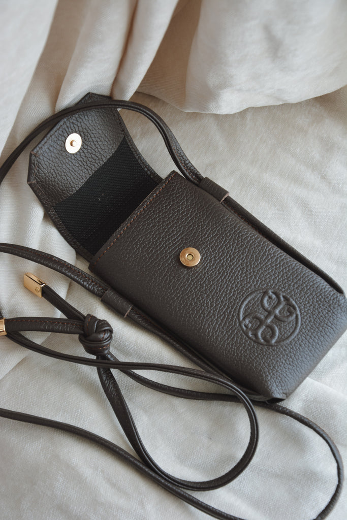 Μικρή δερμάτινη τσάντα κινητού, με δεμένο λουράκι και χρυσές λεπτομέρειες. Ένα διακριτικό πίσω τσεπάκι χαρίζει πρακτικότητα στη λιτή της κομψότητα.