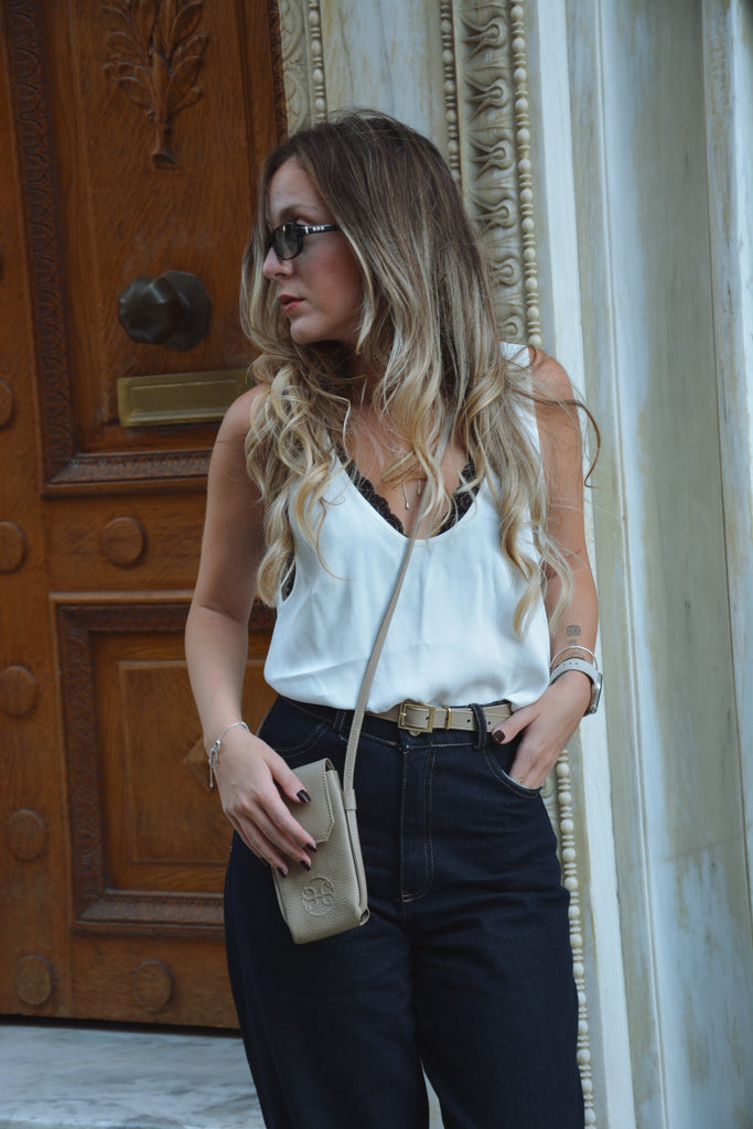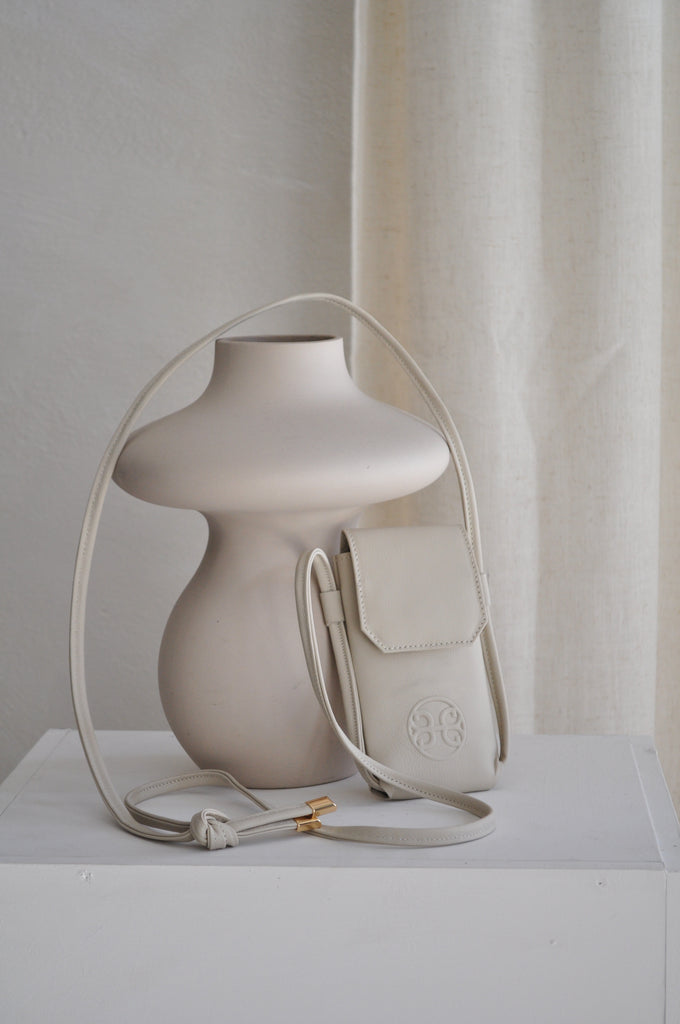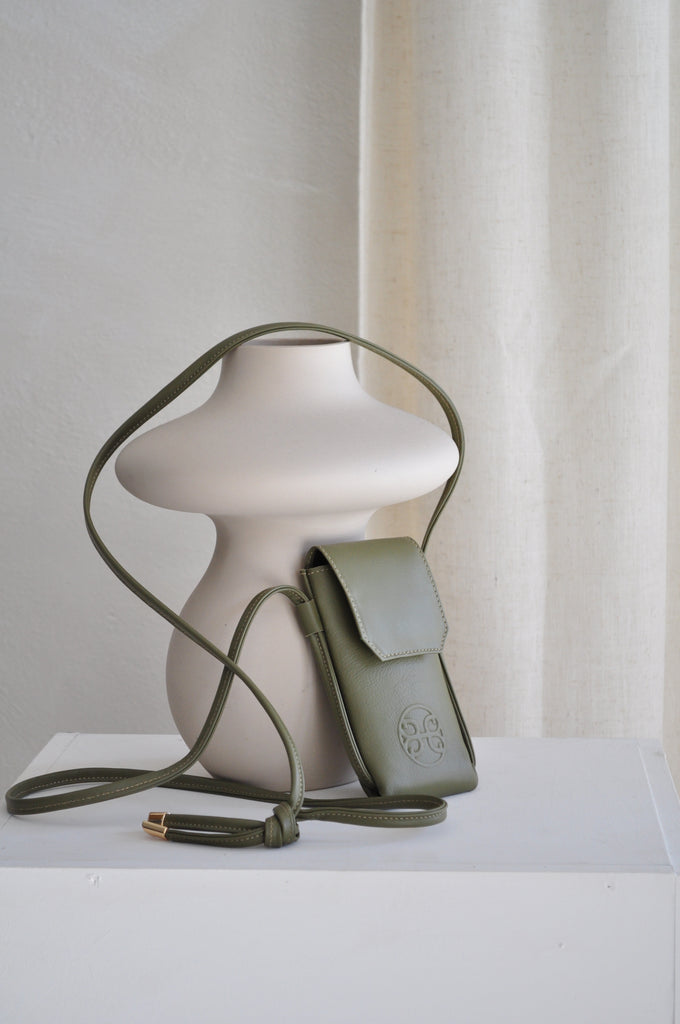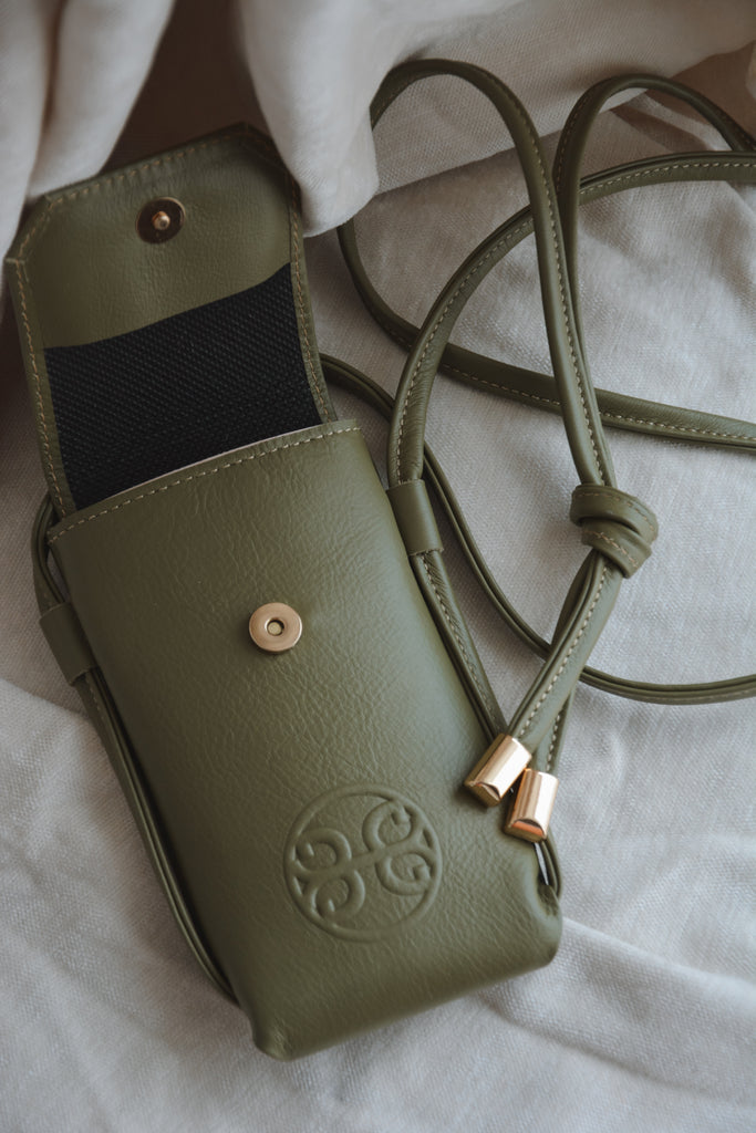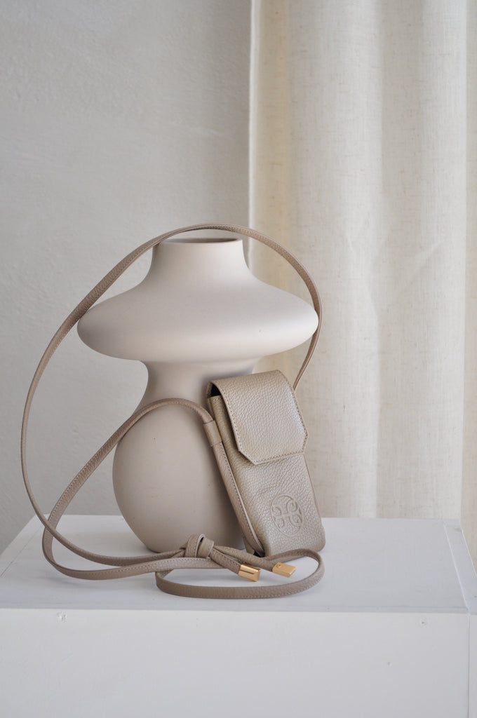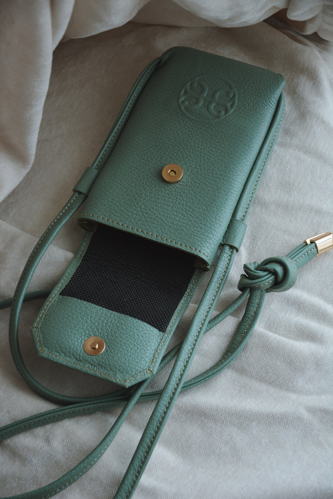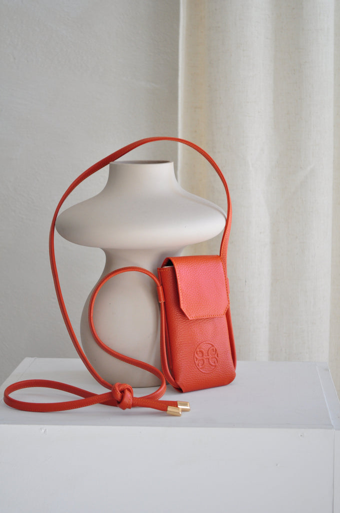 Μικρή δερμάτινη τσάντα κινητού, με δεμένο λουράκι και χρυσές λεπτομέρειες. Ένα διακριτικό πίσω τσεπάκι χαρίζει πρακτικότητα στη λιτή της κομψότητα.