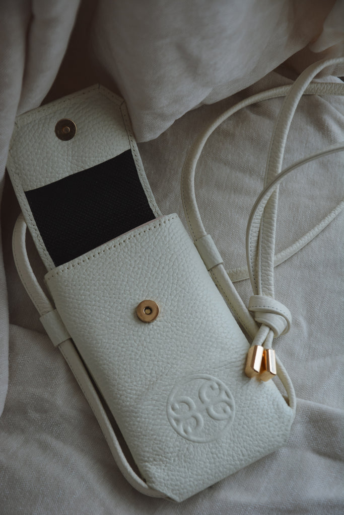Μια κομψή δερμάτινη τσάντα τηλεφώνου, εκλεπτυσμένη με λουράκι με κόμπους και χρυσές λεπτομέρειες. Μια διακριτική πίσω τσέπη προσθέτει λειτουργικότητα στην κομψή της μορφή - ένα μικρό κομμάτι με διαχρονική ισορροπία.