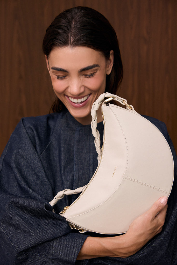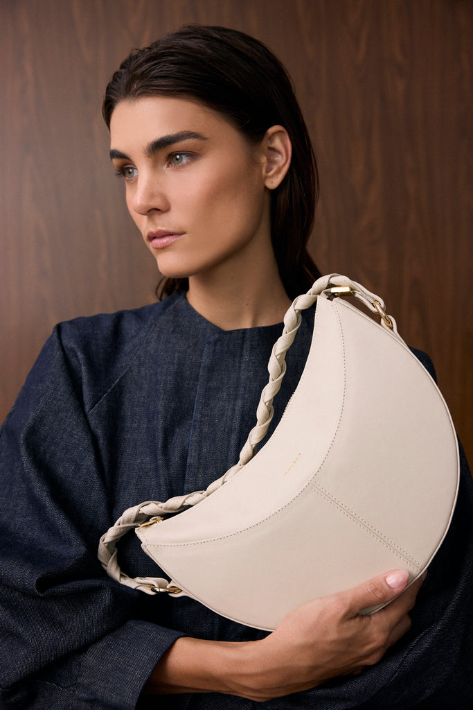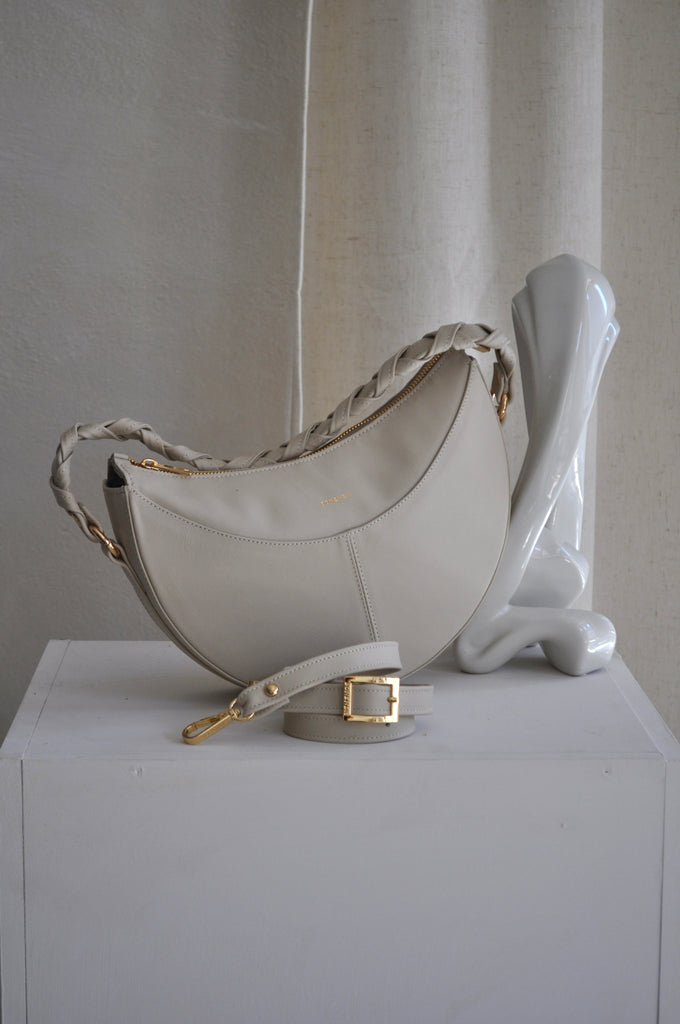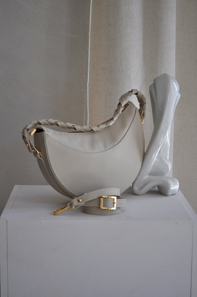 Η Sophie είναι η τσάντα που συνδυάζει μοναδικότητα και κομψότητα. Με ιδιαίτερο σχήμα μισοφέγγαρου, μπορεί να φορεθεί τόσο ως cross body όσο και ως shoulder bag ενώ το ξεχωριστό πλεκτό δερμάτινο χερούλι της αναδεικνύει κάθε εμφάνιση με στυλ