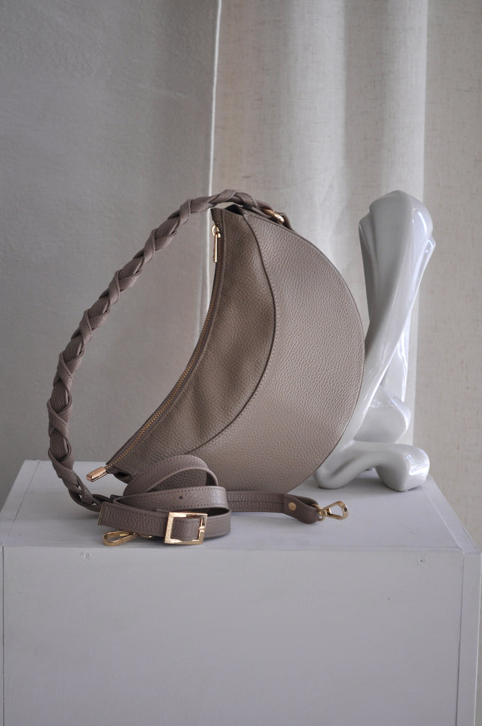 Η Sophie είναι η τσάντα που συνδυάζει μοναδικότητα και κομψότητα. Με ιδιαίτερο σχήμα μισοφέγγαρου, μπορεί να φορεθεί τόσο ως cross body όσο και ως shoulder bag ενώ το ξεχωριστό πλεκτό δερμάτινο χερούλι της αναδεικνύει κάθε εμφάνιση με στυλ