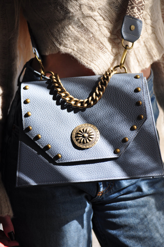 H Chiara δερμάτινη τσάντα ώμου είναι ένα statement κομμάτι που ήρθε για να μείνει. Έτοιμη να σε κάνει να ξεχωρίσεις η Chiara δερμάτινη τσάντα ώμου, με μια εντυπωσιακή μεταλλική αγκράφα , και έντονη μεταλλική αλυσίδα μετατρέπεται και σε τσάντα χειρός. Οι μεταλλικές της λεπτομέρειες δίνουν την αίσθηση πολυτέλειας σε κάθε χρήση. Ο εντυπωσιακός ιμάντας δίνει ένταση στο στυλ σας και ρυθμίζεται για να φορεθεί σε όποιο μήκος επιθυμείτε.