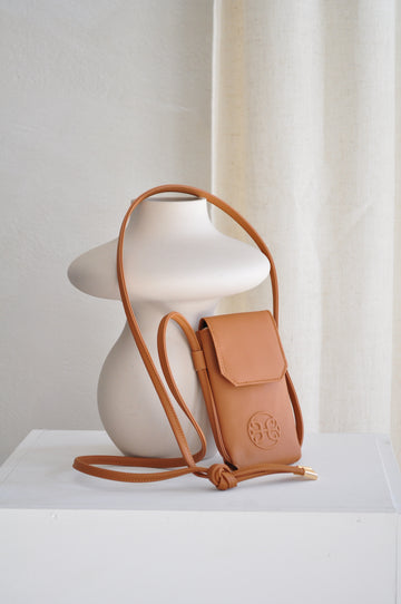 Μια κομψή δερμάτινη τσάντα τηλεφώνου, εκλεπτυσμένη με λουράκι με κόμπους και χρυσές λεπτομέρειες. Μια διακριτική πίσω τσέπη προσθέτει λειτουργικότητα στην κομψή της μορφή - ένα μικρό κομμάτι με διαχρονική ισορροπία.