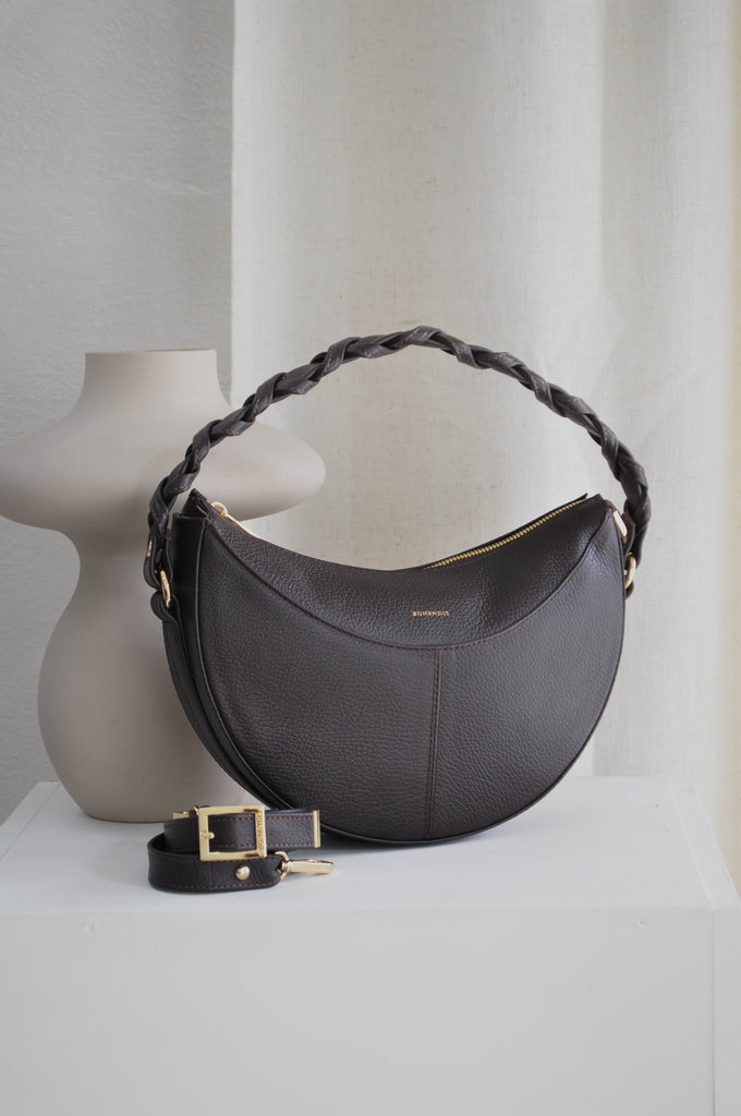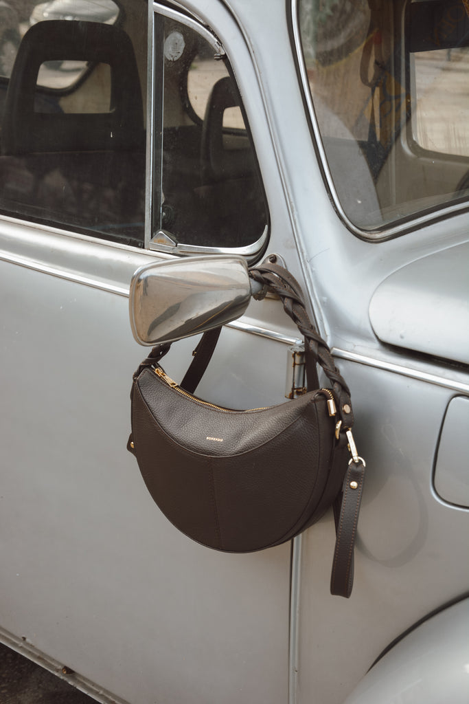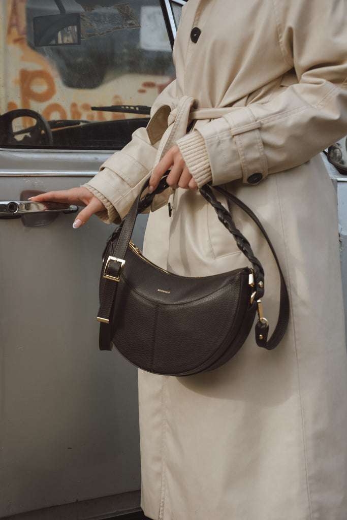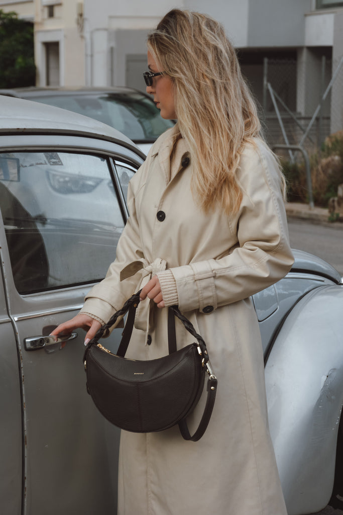 Η Sophie είναι η τσάντα που συνδυάζει μοναδικότητα και κομψότητα. Με ιδιαίτερο σχήμα μισοφέγγαρου, μπορεί να φορεθεί τόσο ως cross body όσο και ως shoulder bag ενώ το ξεχωριστό πλεκτό δερμάτινο χερούλι της αναδεικνύει κάθε εμφάνιση με στυλ